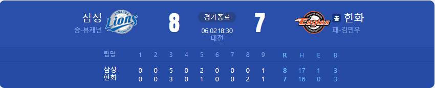 삼성 라이온즈가 한화 이글스 상대로 8 대 7 승리를 가져갑니다.