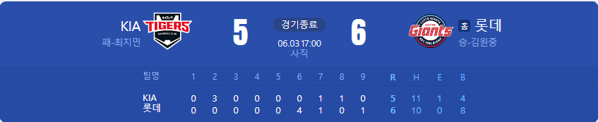 롯데 자이언츠가 KIA 타이거즈를 상대로 6 대 5 승리를 가져갑니다.