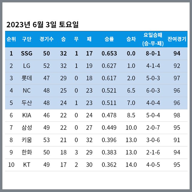 | 230604 일요일 KBO 정규시즌 리뷰 및 순위 확인 (0) | 2023.06.06 |