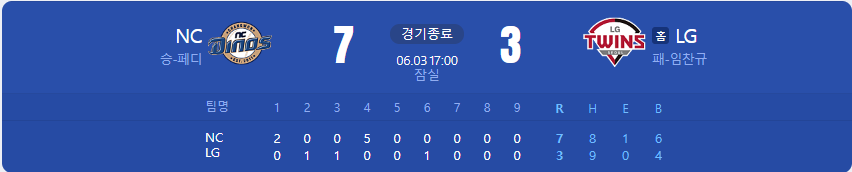 NC 다이노스가 LG 트윈스를 상대로 7 대 3 승리를 가져갑니다.