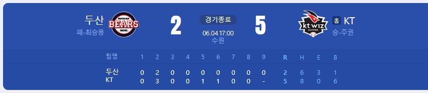 KT 위즈가 두산 베어스를 상대로 5 대 2 승리를 가져갑니다.