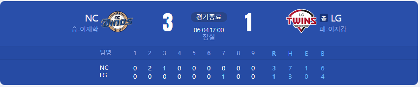 NC 다이노스가 LG 트윈스를 상대로 3 대 1 승리를 가져갑니다.