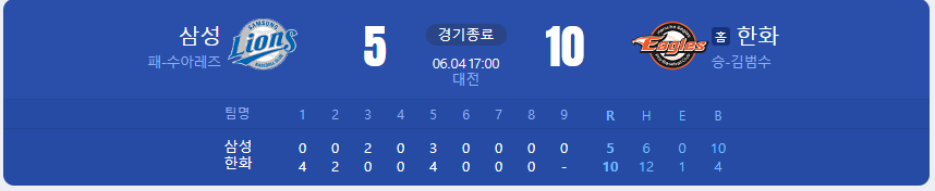 한화 이글스가 삼성 라이온즈를 상대로 10 대 5 승리를 가져갑니다.
