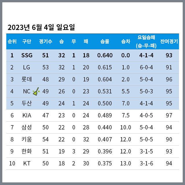 | 2023년 5월 KBO 10개 구단 팀별 순위 변동 확인 (0) | 2023.06.05 |