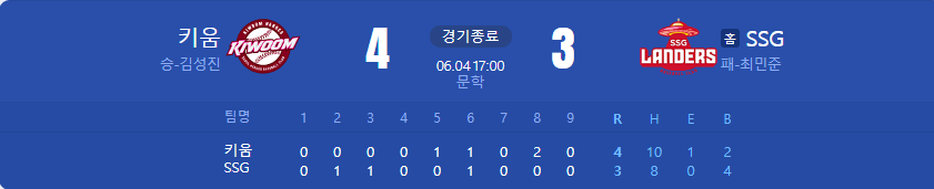 키움 히어로즈가 SSG 랜더스를 상대로 4 대 3 승리를 가져갑니다.