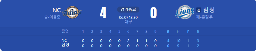 NC 다이노스가 삼성 라이온즈를 상대로 4 대 0 승리를 가져갑니다.