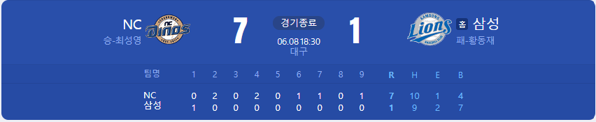NC 다이노스가 삼성 라이온즈를 상대로 7 대 1 승리를 가져갑니다.