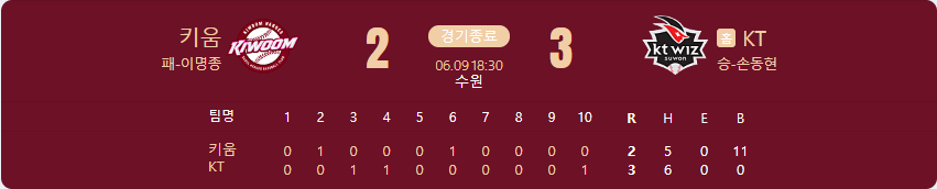 KT 위즈가 키움 히어로즈를 상대로 3 대 2 승리를 가져갑니다.