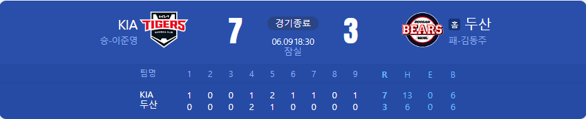KIA 타이거즈가 두산 베어스를 상대로 7 대 3 승리를 가져갑니다.