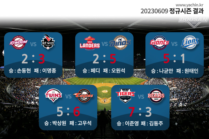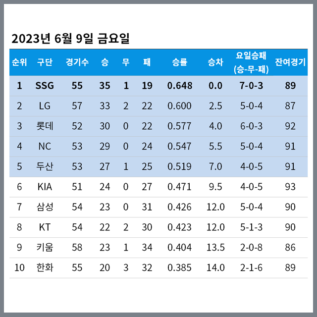 2023년 6월 9일 금요일 정규시즌 순위