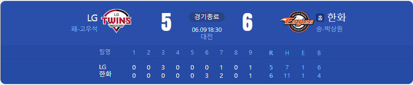 한화 이글스는 3 대 4로 뒤지고 있던 7회 말 김인환선수의 2타점 적시 2루타로 전세를 뒤집었지만, 9회 초 마무리 투수 박상원선수가 볼넷 3개를 남발하며 1점 차 리드를 지키지 못하며 동점을 허용했습니다.