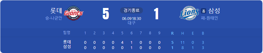롯데 자이언츠가 삼성 라이온즈를 상대로 5 대 1 승리를 가져갑니다.