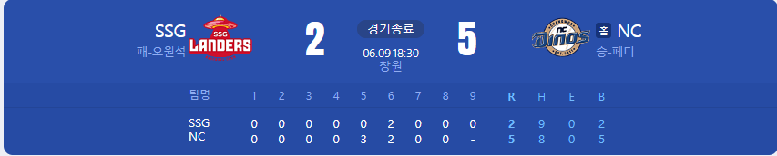 NC 다이노스가 SSG 랜더스를 상대로 5 대 2 승리를 가져갑니다.
