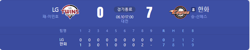 한화 이글스가 LG 트윈스를 상대로 7 대 0 승리를 가져갑니다.