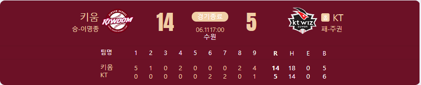 키움 히어로즈가 KT 위즈를 상대로 14 대 5 승리를 가져갑니다.