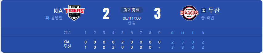 허리 통증 부상을 이겨내고 복귀한 두산의 선발 투수 곽빈선수는 6이닝 동안 2실점 호투 하며 승리를 안았고, KIA의 선발투수로 등판해 6이닝 동안 3실점한 루키 윤영철선수는 타선의 지원을 받지 못한 채 패전 투수를 기록했습니다.