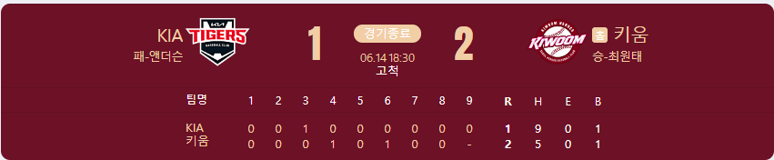 키움 히어로즈가 KIA 타이거즈를 상대로 2 대 1 승리를 가져갑니다.