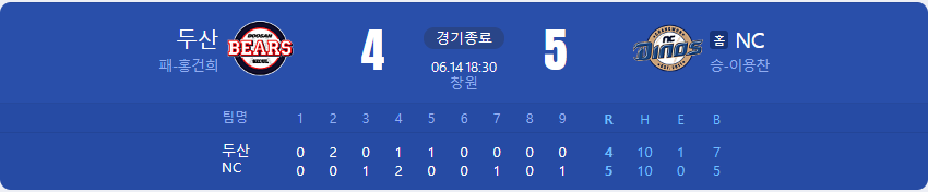 NC 다이노스가 두산 베어스를 상대로 5 대 4 승리를 가져갑니다.