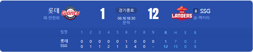 SSG 랜더스가 롯데 자이언츠를 상대로 12 대 1 승리를 가져갑니다.