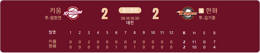 키움 히어로즈와 한화 이글스의 경기는 2 대 2 무승부로 마무리됩니다.