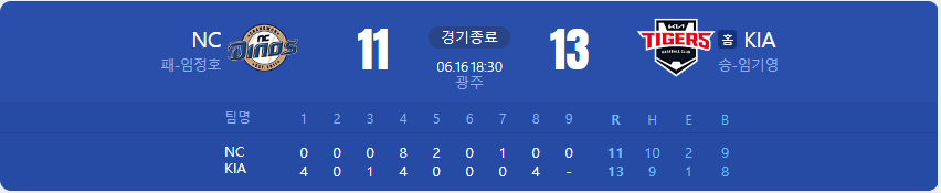 KIA 타이거즈가 NC 다이노스를 상대로 13 대 11 승리를 가져갑니다.