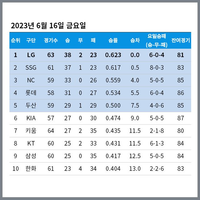 | 230615 목요일 KBO 정규시즌 리뷰 및 순위 확인 (0) | 2023.06.17 |