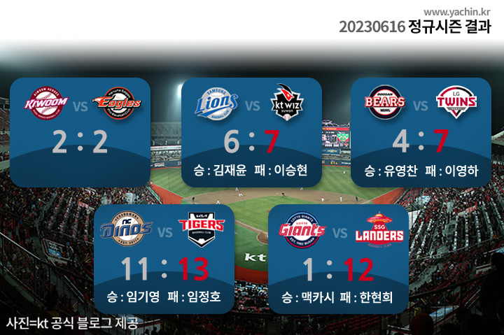 | 230613 화요일 KBO 정규시즌 리뷰 및 순위 확인 (0) | 2023.06.14 |