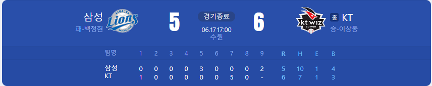KT 위즈가 삼성 라이온즈를 상대로 6 대 5 승리를 가져갑니다.