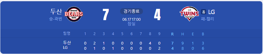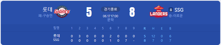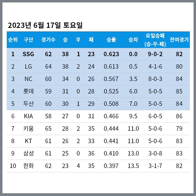 2023년 6월 17일 토요일 정규시즌 순위