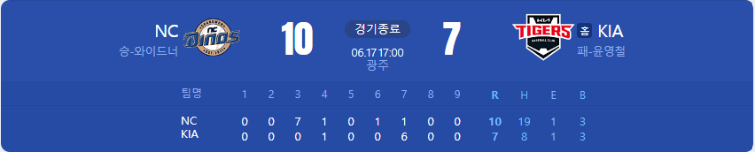 NC 다이노스가 KIA 타이거즈를 상대로 10 대 7 승리를 가져갑니다.