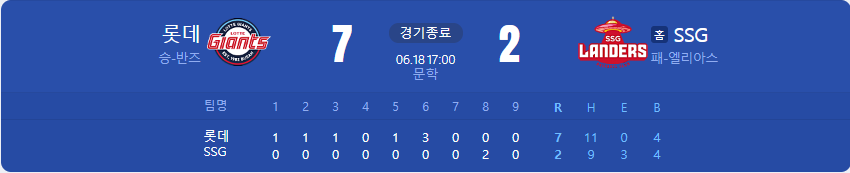 롯데 자이언츠가 SSG 랜더스를 상대로 7 대 2 승리를 가져갑니다.