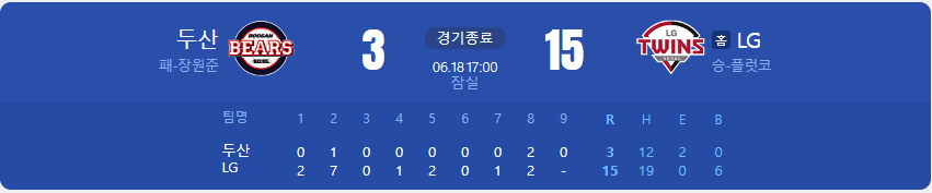 LG 트윈스가 두산 베어스를 상대로 15 대 3 승리를 가져갑니다.