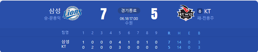 삼성 라이온즈가 KT 위즈를 상대로 7 대 5 승리를 가져갑니다.