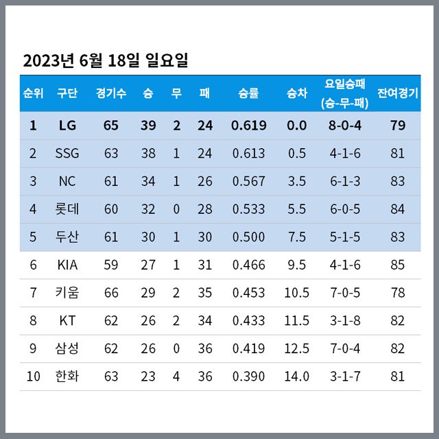 | 230615 목요일 KBO 정규시즌 리뷰 및 순위 확인 (0) | 2023.06.17 |