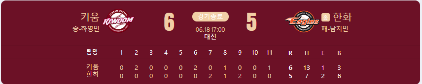 키움 히어로즈가 한화 이글스를 상대로 6 대 5 승리를 가져갑니다.