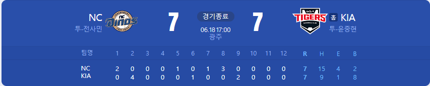 NC 다이노스와 KIA 타이거즈의 경기는 7 대 7 무승부로 마무리가 됩니다.