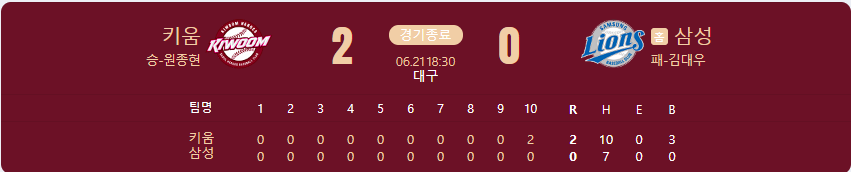 키움 히어로즈가 삼성 라이온즈를 상대로 2 대 0 연장승을 가져갑니다.