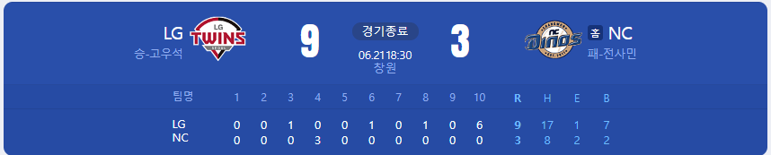 LG 트윈스가 NC 다이노스를 상대로 9 대 3 승리를 가져갑니다.
