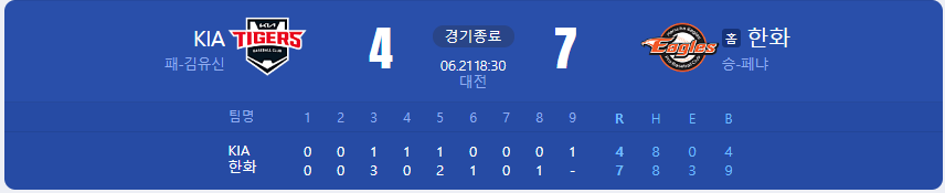 한화 이글스가 KIA 타이거즈를 상대로 7 대 4 승리를 가져갑니다.