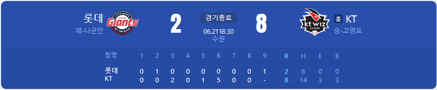 KT 위즈가 롯데 자이언츠를 상대로 8 대 2 승리를 가져갑니다.
