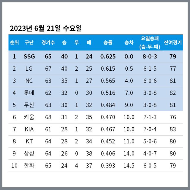 230621 수요일 KBO 정규시즌 리뷰 및 순위 확인