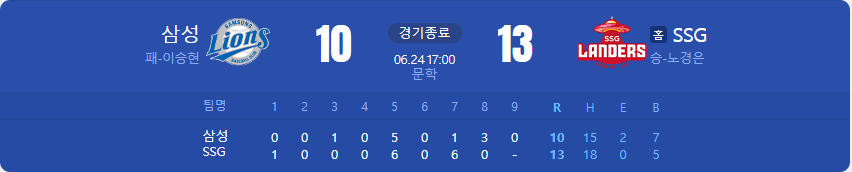 SSG 랜더스가 삼성 라이온즈를 상대로 13 대 10 승리를 가져갑니다.
