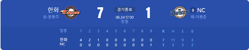 한화 이글스가 NC 다이노스를 상대로 7 대 1 승리를 가져갑니다.