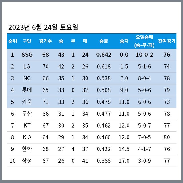 | 230623 금요일 KBO 정규시즌 리뷰 및 순위 확인 (0) | 2023.06.26 |