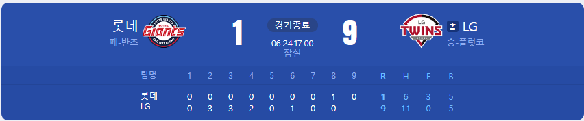 LG 트윈스가 롯데 자이언츠를 상대로 9 대 1 승리를 가져갑니다.