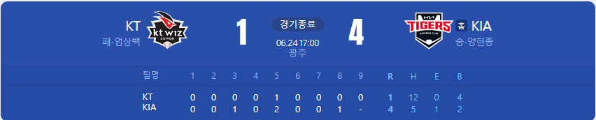 KIA 타이거즈가 KT 위즈를 상대로 4 대 1 승리를 가져갑니다.