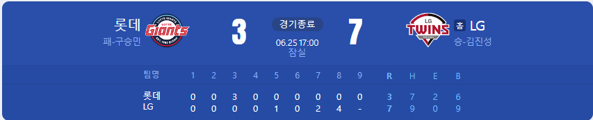 LG 트윈스가 롯데 자이언츠를 상대로 7 대 3 승리를 가져갑니다.