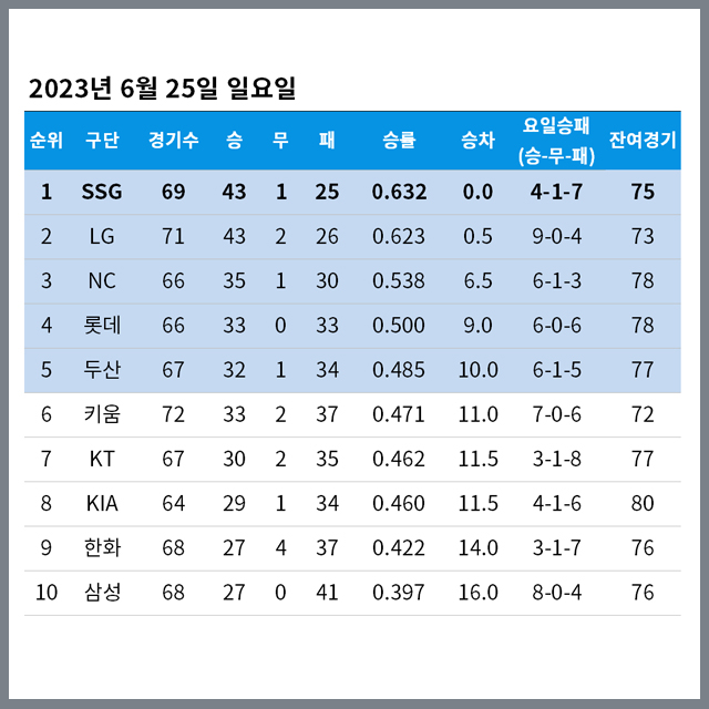 2023년 6월 25일 일요일 정규시즌 순위