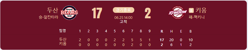 두산 베어스가 키움 히어로즈를 상대로 17 대 2 승리를 가져갑니다.