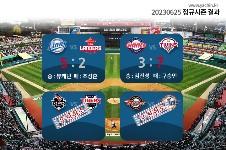 | 230629 프로야구 LG 트윈스 vs SSG 랜더스 / KT 위즈 vs 한화 이글스 우천취소 (0) | 2023.06.29 |